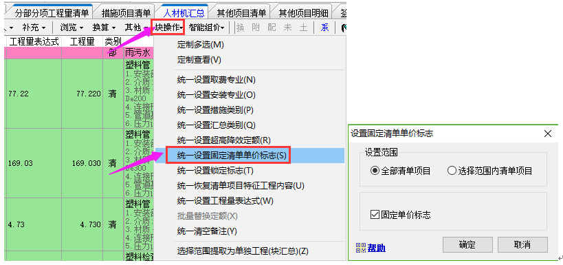如果清單全部要固定:需按上面操作完之后,再點擊塊操作下的統(tǒng)一設(shè)置固定清單單價標志功能。