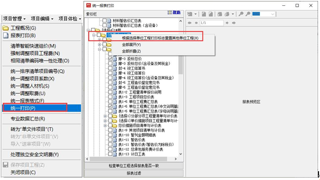 答:(1)項目工程中,點擊“項目管理”下拉選擇“統(tǒng)一打印”功能,進入報表打印界面。如下圖所示: