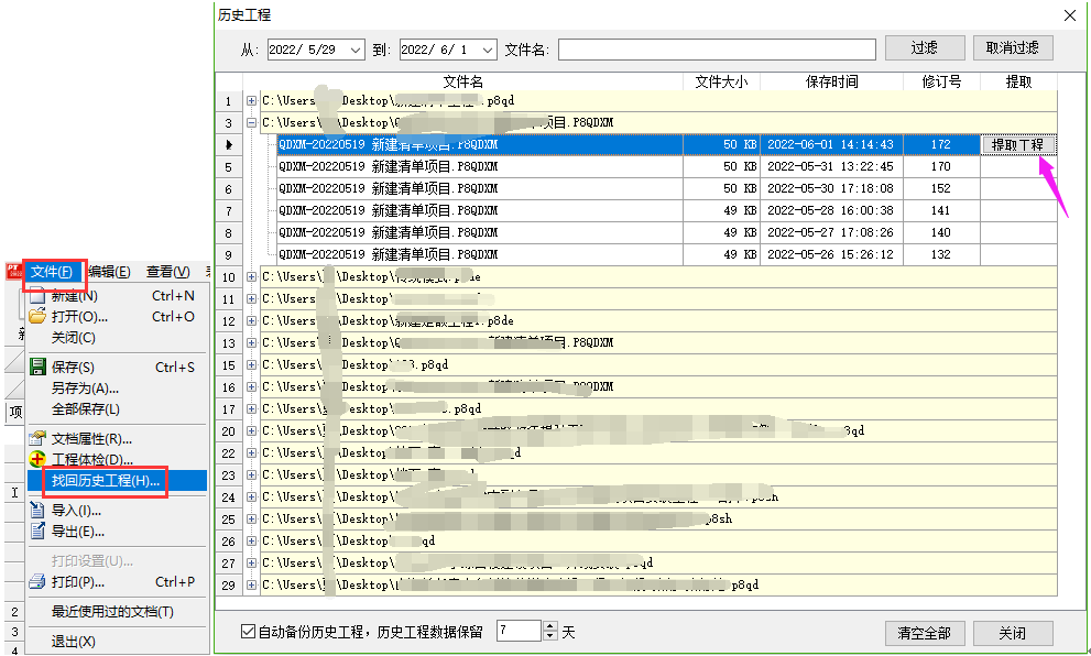 答:軟件提供找回歷史工程的功能,默認是保留七天以內(nèi)的工程數(shù)據(jù)的。 點擊菜單欄文件下的找回歷史工程,在彈出的窗口找到對應(yīng)工程點開加號,對照保存時間列找到相應(yīng)時間點的工程,提取工程數(shù)據(jù)即可。如下所示: