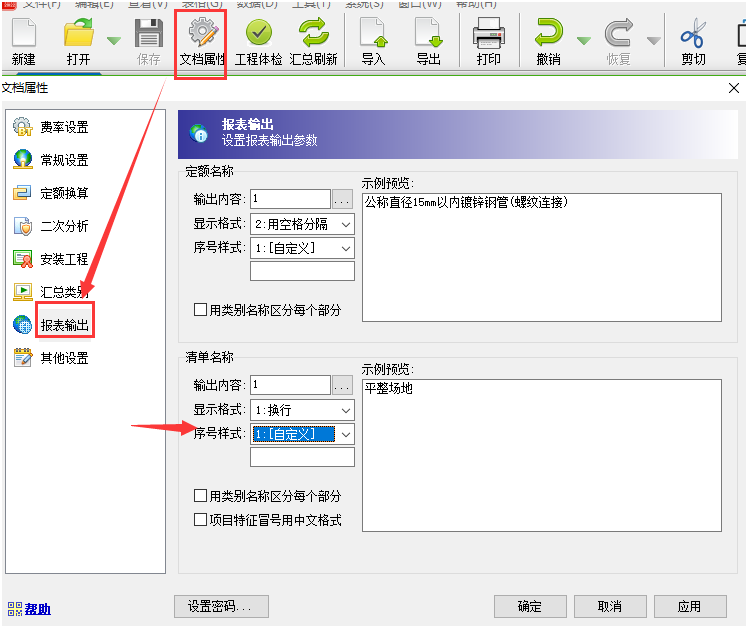 答:本身清單項目特征序號自動有默認排序,導入Excel版工程量清單之后項目特征序號出現(xiàn)了重復。 按照以下截圖,通過文檔屬性窗口的報表輸出功能,把序號樣式改成自定義即可。