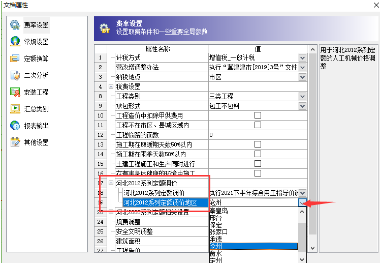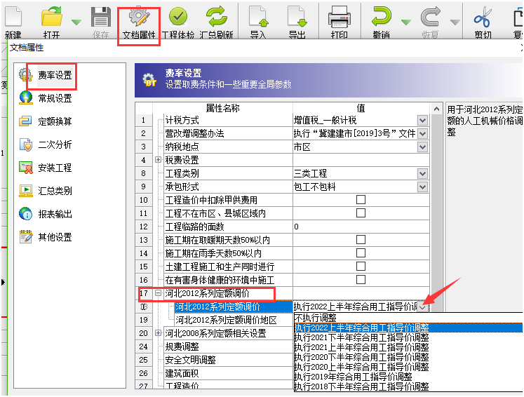 答:各地市出文件的時間不一致,大家使用的時候一定要更新到最新版本軟件程序。 更新到最新版本之后,點擊文檔屬性窗口,在默認的第一個費率設(shè)置界面可以切換選擇對應(yīng)時間對應(yīng)地市的人工指導價文件。如下截圖: