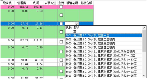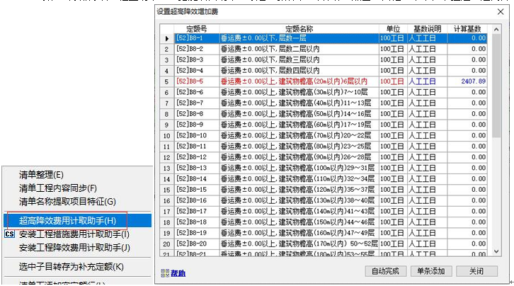 3)、執(zhí)行該命令,彈出如下窗口,應(yīng)計取的超高及垂運費用定額將變成紅色,其計取基數(shù)變成藍色。 4)、直接雙擊紅色定額行 或 點擊“單條添加”按鈕,可實現(xiàn)單條添加該項費用定額到當前選擇的位置。點擊“自動完成”按鈕,將自動添加當前工程所有的“垂運費”和“超高費”定額,點擊“自動完成”按鈕后,點擊自動完成,系統(tǒng)自動檢測工程中是否已經(jīng)存在相關(guān)費用定額。如已經(jīng)計取了相關(guān)費用,會進行提示。