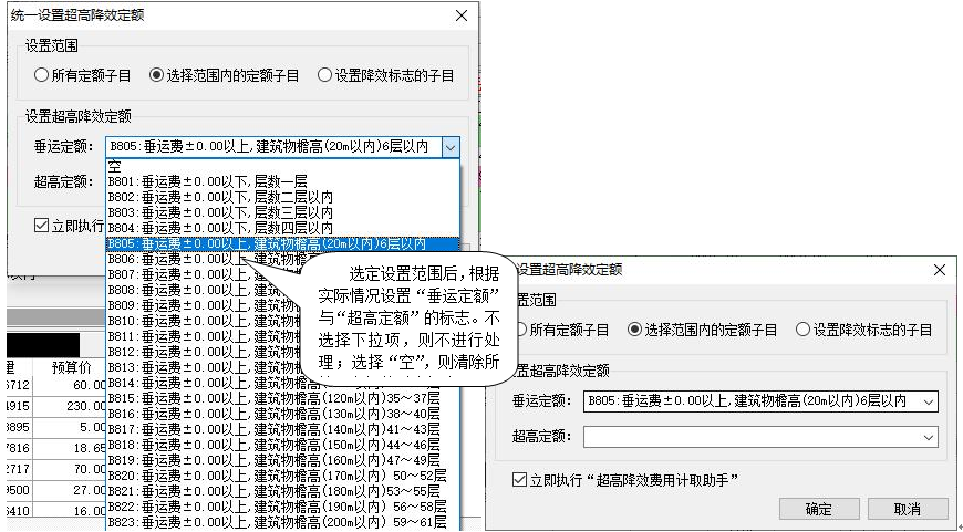 (3)通過“塊操作”下的“統(tǒng)一設(shè)置超高降效定額”功能,可對選中的定額進行統(tǒng)一設(shè)置超高降效標志。如下圖所示: