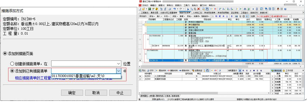 6)、點擊“確定”按鈕,由于當前工程為清單工程,系統(tǒng)自動將費用定額添加到措施頁面中對應(yīng)措施項目下,如下圖: