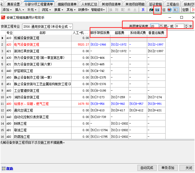 答:針對安裝專業(yè)的工程,咱們軟件提供了安裝工程措施費用計取助手(也就是CS按鈕)的功能,一鍵計取安裝專業(yè)的超高費、垂運費、腳手架搭拆費和系統(tǒng)調(diào)試費這四項費用。 注意功能操作之前不需要特意選中定額子目,軟件會自動識別到安裝定額庫各個分冊的子目,來自動統(tǒng)計基數(shù),截圖如下: