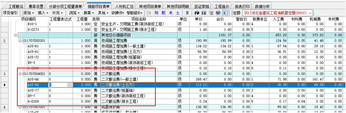 答:清單工程中在措施項目清單界面,根據(jù)需要可以進行刪減。例如,二次搬運費不需要計取了,可以直接刪掉或者清單和定額工程量同時改0。如下截圖: