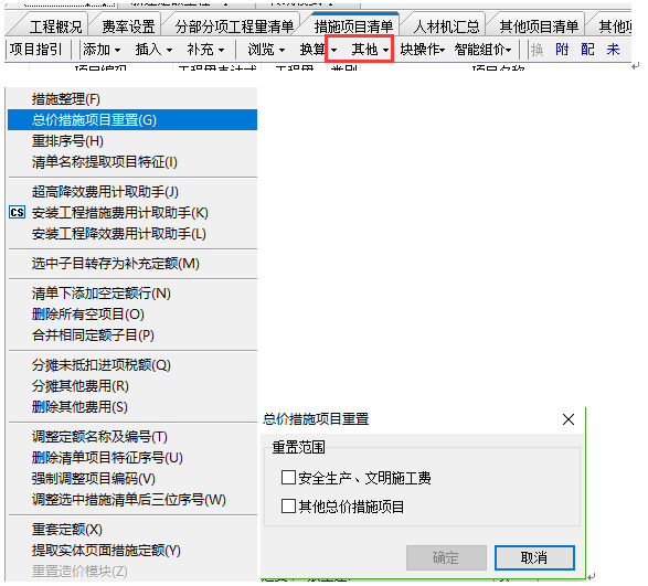 答:更新到最新版本之后,清單工程中如果安全文明或者總價措施修改了想要恢復到默認計取的狀態(tài)??梢栽诖胧╉椖壳鍐谓缑?,點擊其他按鈕下的總價措施項目重置。